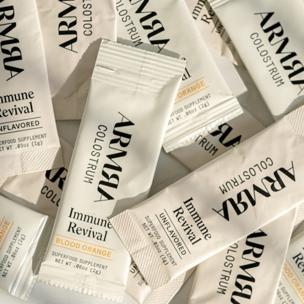 There are a few different options available on ARMRA Colostrum’s website. Choose between the Immune Revival Stick Packs, which comes with 30 single-serving powder packets perfect for taking on the go, or the Immune Revival Bulk Jar (their best-selling product), a large-format tub which contains 120 servings. Many people take 2-4 servings daily, though there’s no real limit to the amount you can take.