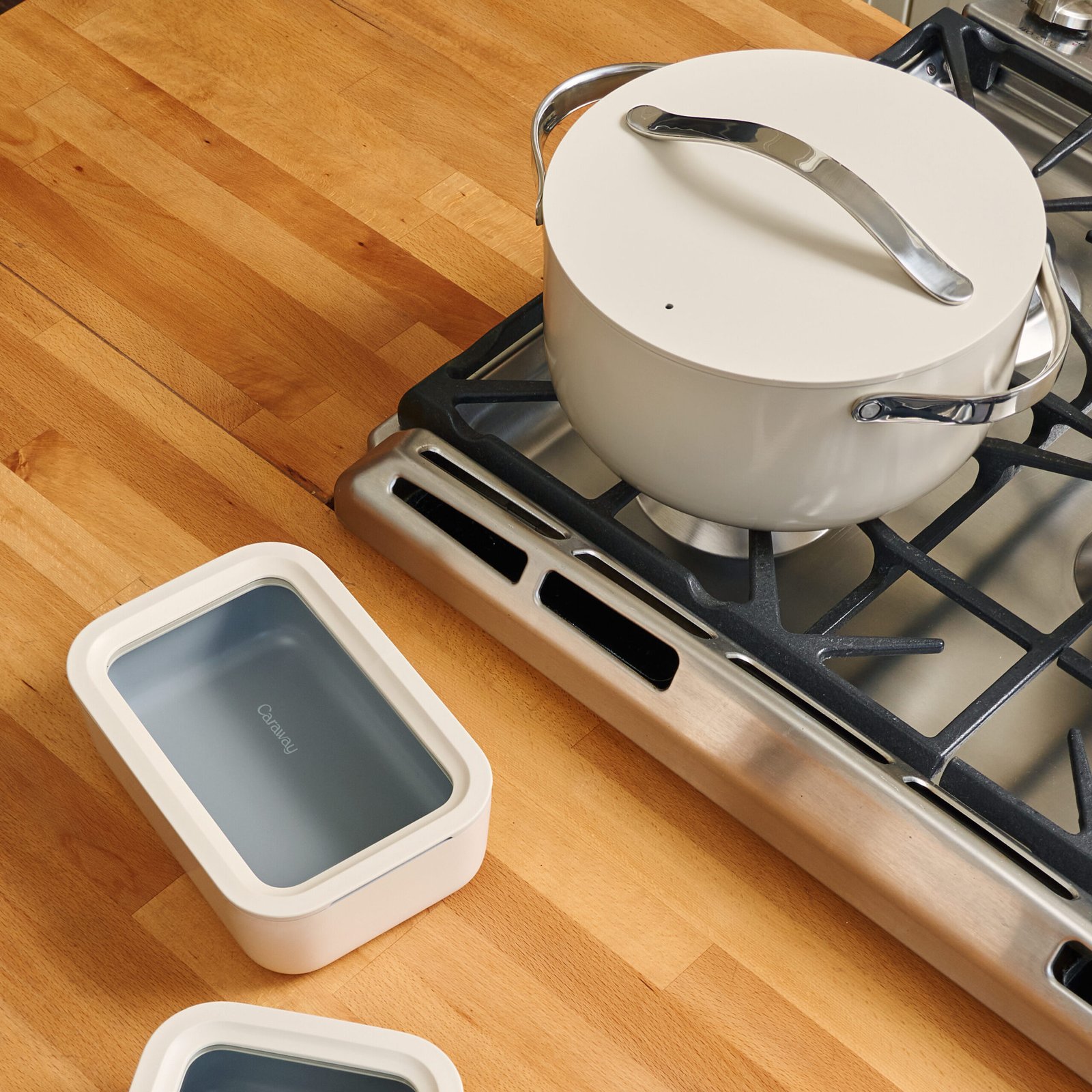 But the reason Caraway resonates with so many people—in my opinion—is that they literally think of everything. In the Cookware Set, for example, things like the magnetic storage rack, the safety bump in the handle, the versatility to make any recipe with just four pieces, and the canvas lid holder set it far above and beyond comparable products. And the Food Storage Set is no different.