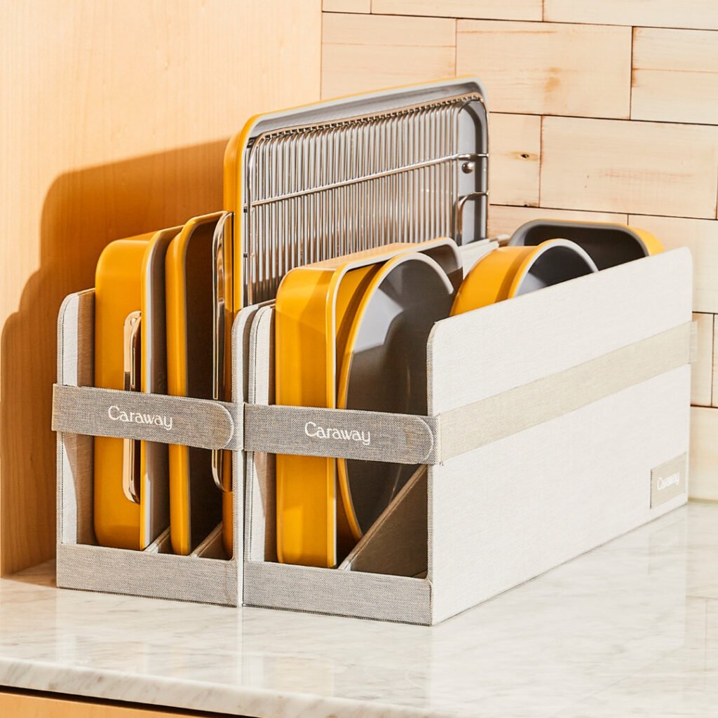 - Ingenious storage solutions: Because cooking and cleanup are only part of the picture. Caraway’s cookware, bakeware, and food storage sets all come with convenient vertical storage solutions—so you can grab and go without turning your cabinets upside-down.