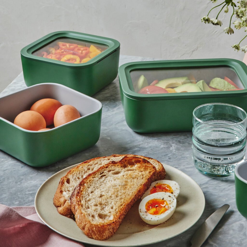 The round-edged containers of the Food Storage Set feature one of six classic Caraway hues on the sides, plus see-through glass lids so you always know what’s inside. And since each piece is coated with Caraway’s ceramic non-stick, they’re easy to clean and never stain or smell.