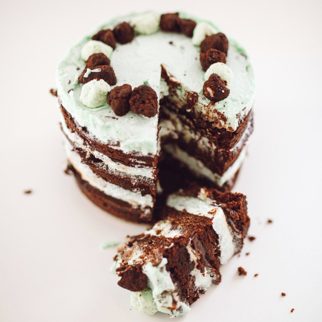 It’s the ultimate holiday combo, sporting layers of double chocolate chip cake, gooey chocolate jam, mint chip frosting, minty milk crumble between the layers, and, my personal favorite, minty milk crumb and chocolate crumb on top.