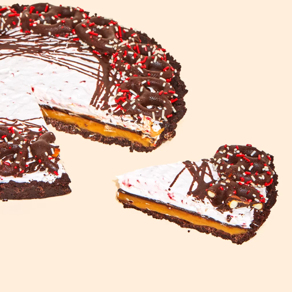 Peppermint bark is a holiday essential at my house, so turning this classic dessert on its head and cranking up the deliciousness by 200% is just *chef’s kiss.* Starting with a dark chocolate crust, this pie is layered with candy cane nougat and vanilla cocoa caramel, drizzled with dark chocolate, then topped with salty-sweet chocolate-dipped holiday pretzels.