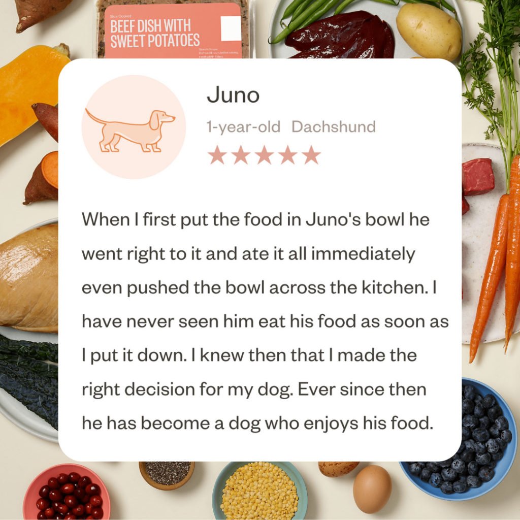 You can pick between four different recipes: beef, chicken, turkey, and lamb—or choose them all if you want! Each is packed with high-quality animal protein, vitamin-rich greens like kale or spinach, and fiber-rich veggies like pumpkin and sweet potato. Lola’s partial to the lamb option with cranberries and butternut squash, but I love being able to serve her different meals every day. She’s eating better than I am, honestly.
